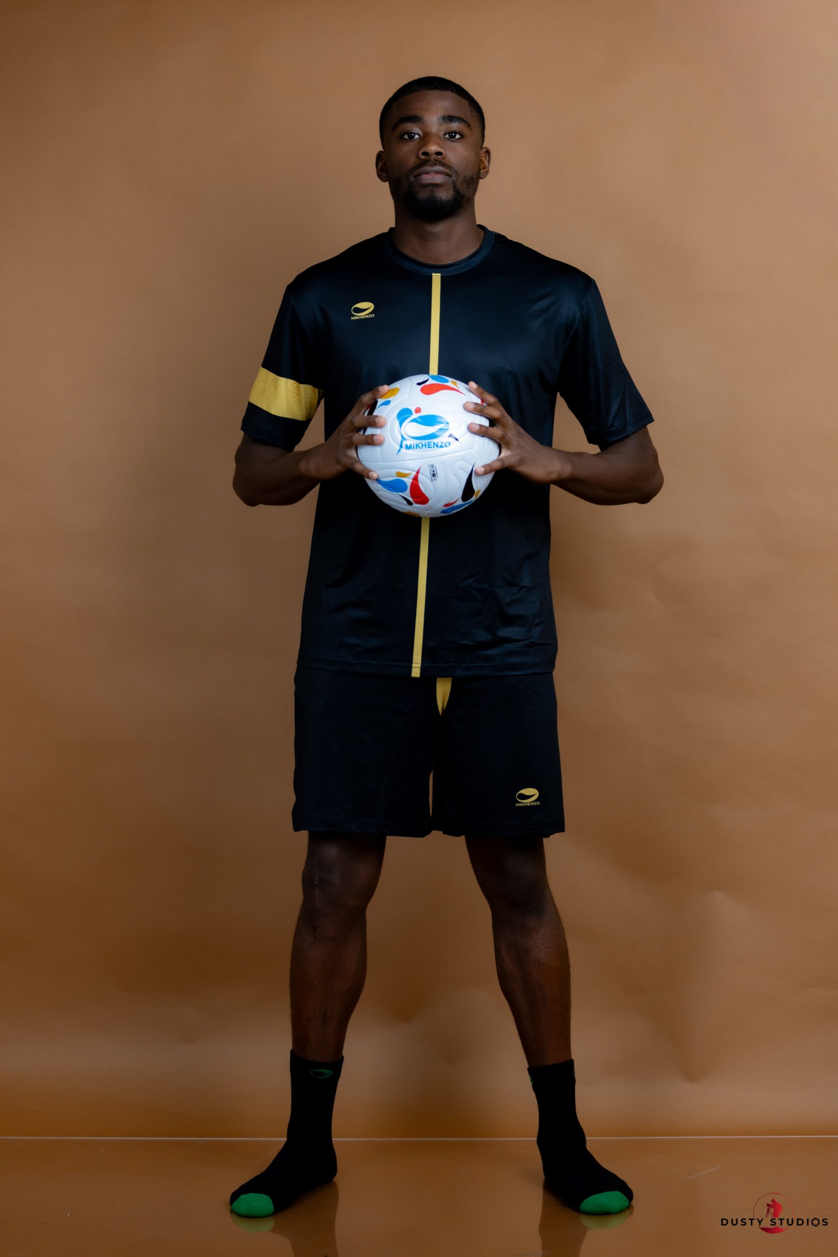 – Black body Shirt and shorts along with Gold logo on the right chest