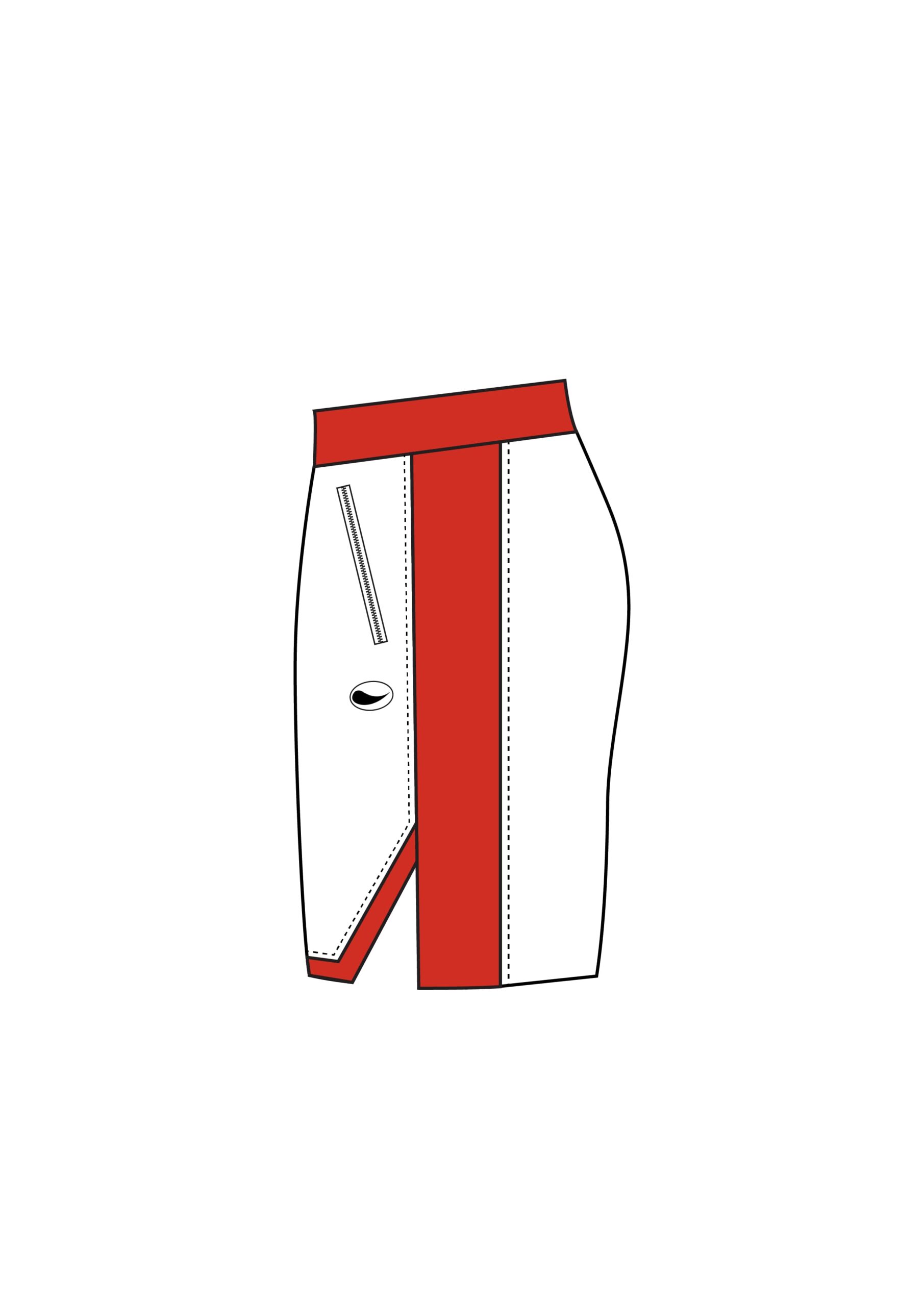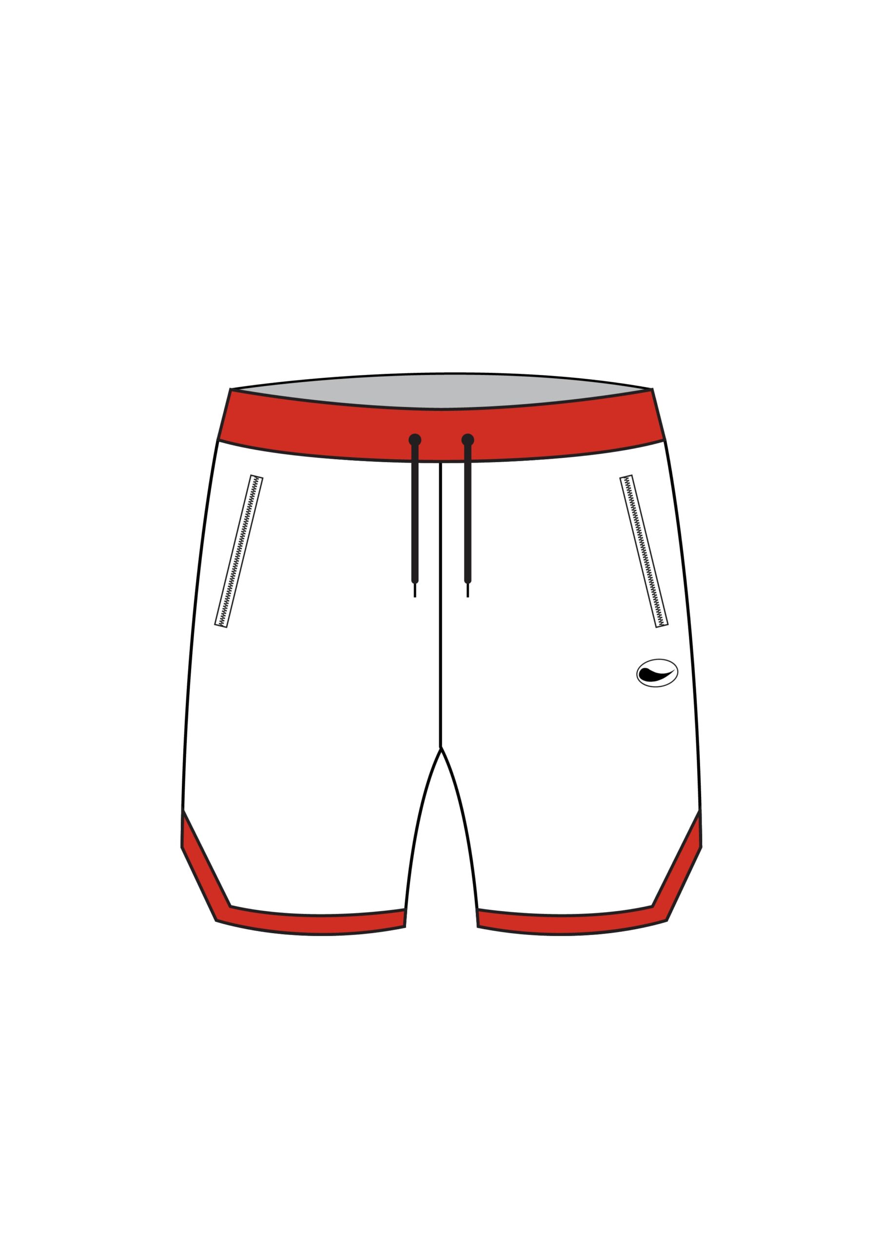 – White color body shorts with Red Maple color for front lower L/R thigh strip, pocket rim lining; left/right waist sides and waist band.
